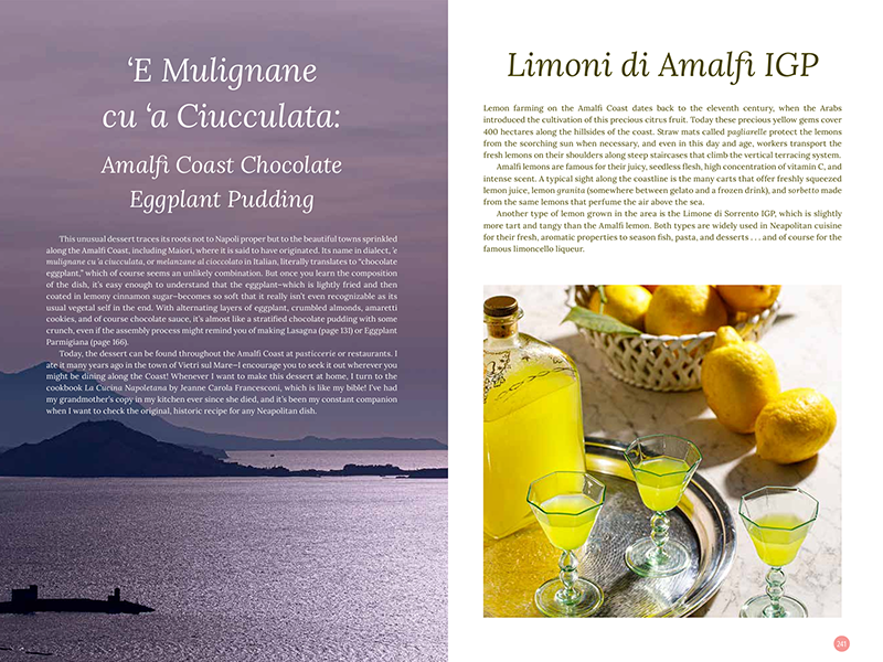 More than 60 recipes follow the structure of a traditional Italian meal: Antipasti (appetizers, breads, and savory tarts); Fritti (Naples’s iconic fried street foods); Primi (pasta dishes); Pasta al Forno, Riso e Zuppe (baked pastas, rice dishes, and soups); Secondi (meat, fish, and vegetarian mains); Contorni (vegetable sides); and Dolci e Digestivi (desserts and after-dinner drinks). Alongside classics like lasagna napoletana, spaghetti alle vongole, and pastiera, Daniela highlights lesser-known regional specialties including chocolate eggplant.